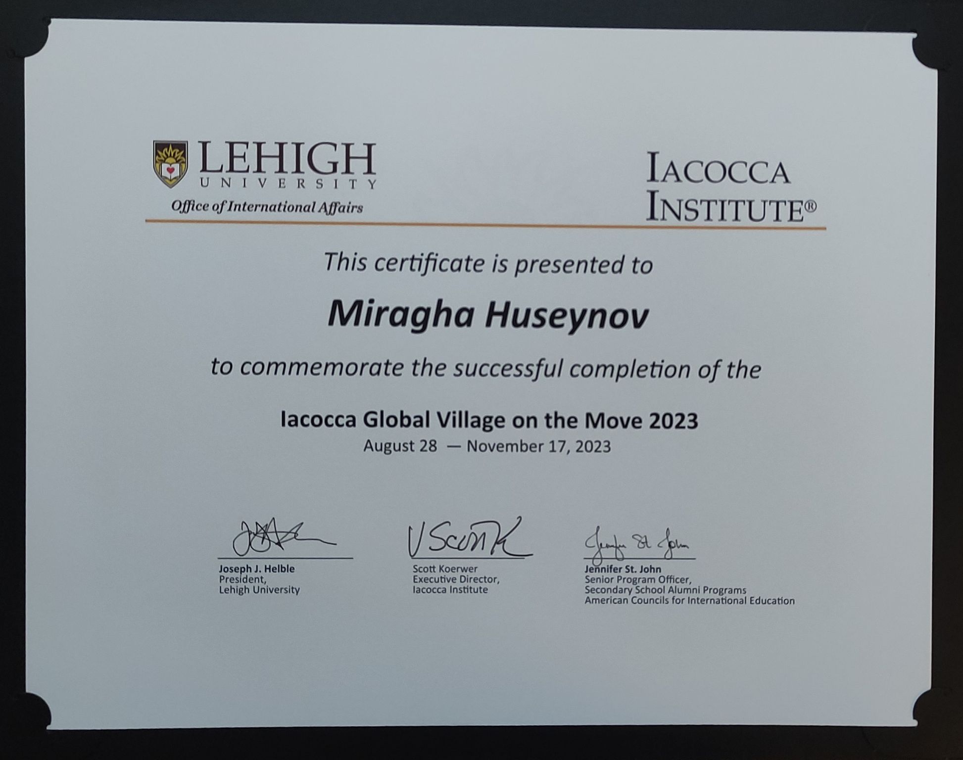 In 2023, he was selected for the prestigious Global Village on the Move program by Lehigh University, participating in both its virtual component (August–October) and in-person segment in Istanbul, Turkey in November. These experiences enriched his leadership perspective and expanded his international network. In 2024, he launched his language school, Millennium Wisdom, and was invited to the Millennium Wisdom. He also completed leadership training at Cornell University, organized by American Councils.